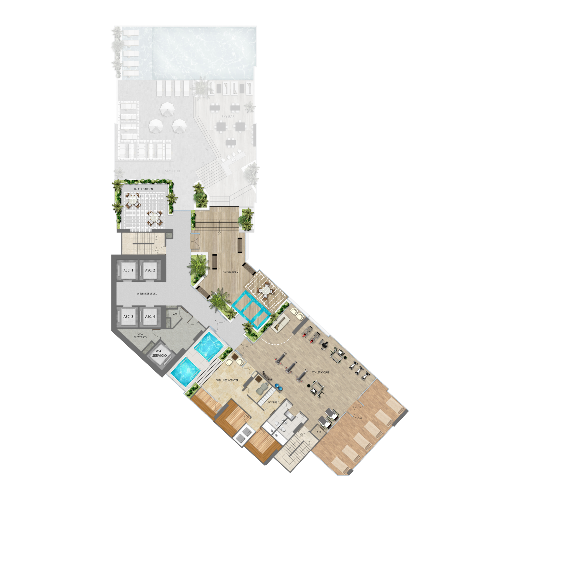 Oasis Level (piętro 42): Klub fitness, centrum wellness, studio jogi, ogród Tai Chi.