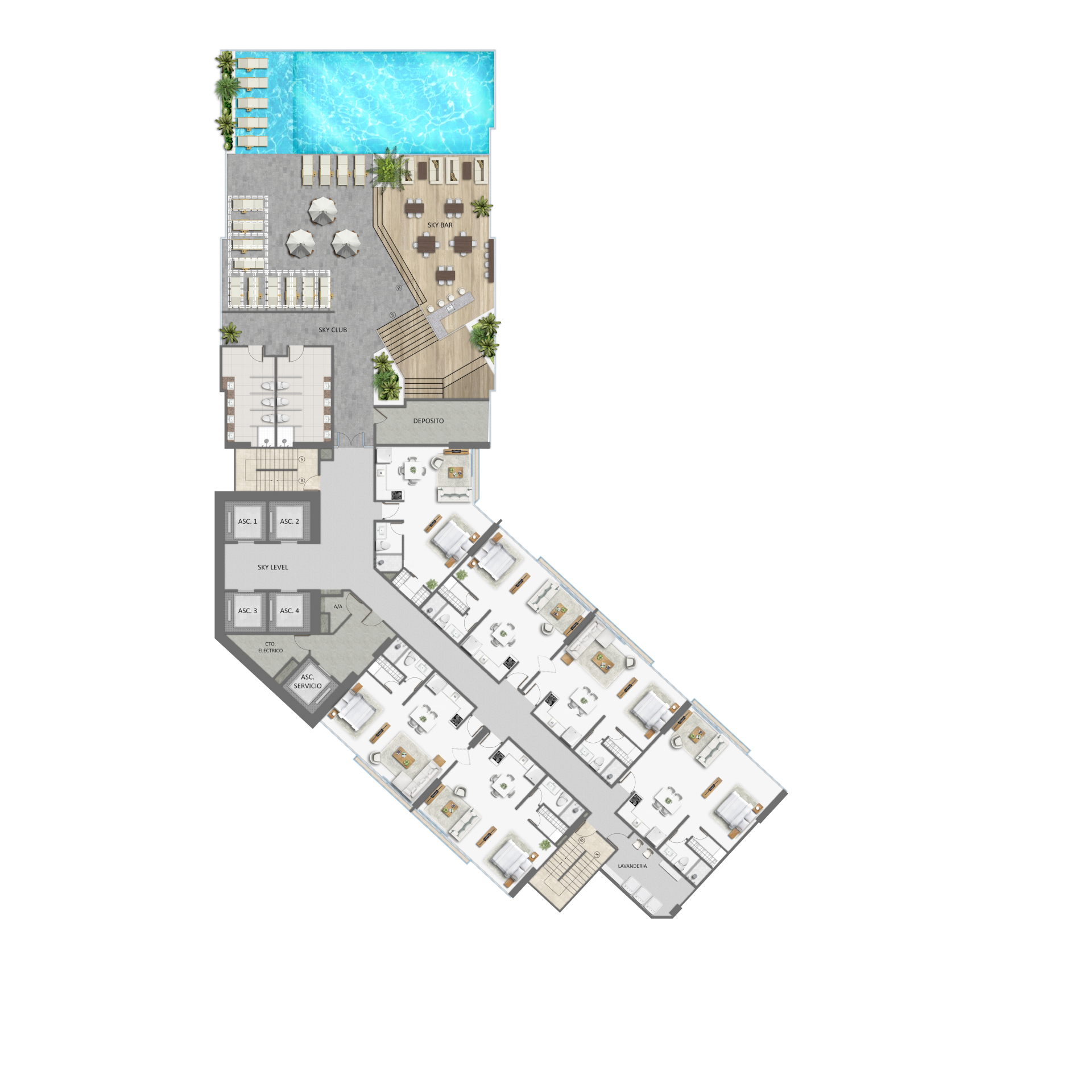 Sky Level (piętro 40): Basen Sky Pool, Sky Bar z panoramicznymi widokami.